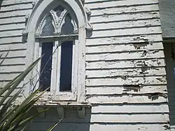 The building is noted for its eclectic exterior ornamentation and its combination of Colonial Revival (sometimes classified as Romanesque Revival) and Carpenter Gothic Victorian architecture.[4] The Los Angeles Cultural Heritage Board has described the Wadsworth Chapel and other original buildings on the Veterans campus as "the most monumental complex of Shingle-style Queen Anne structures ever constructed in the Los Angeles area."[5] The 7,500-square-foot (700 m2) building was built at a cost of $12,400 in 1900 with redwood siding and 21 different types of windows.[3]