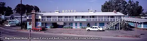 The Wagon Wheel Motel and Restaurant was an example of American roadside architecture from the mid-century. The ranch-style office, motel and restaurant were originally built on the side of Highway 101 and Highway 101A (Alternate) in 1947.[12] The office/restaurant complex incorporated a variety of roof lines, primarily low to medium pitched gables covered with wood shingles and punctuated by several decorative cupolas with weather vanes, and neon lighting. A free-standing 12-unit, two-story motel addition was completed in 1953. One of the most recognizable features of the motel was the giant neon sign that included an animated stagecoach driver and galloping horses.[12][28] The Wagon Wheel was alongside the 101 freeway at the northern edge of a 64-acre (26 ha) site between the Santa Clara River and the Esplanade Shopping Center. The site also included industrial buildings, a trailer park an ice skating rink, a former roller skating rink, a bowling alley and a shopping center, all of which were demolished for redevelopment as a development with retail, for sale residential, condos and two high-rise towers totaling 1500 residential units.[12]
