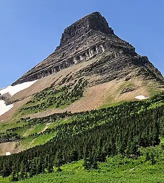 Like the mountains in Glacier National Park, it is composed of sedimentary rock laid down during the Precambrian to Jurassic periods. Formed in shallow seas, this sedimentary rock was initially uplifted beginning 170 million years ago when the Lewis Overthrust fault pushed an enormous slab of precambrian rocks 3 mi (4.8 km) thick, 50 miles (80 km) wide and 160 miles (260 km) long over younger rock of the cretaceous period.[5]