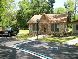 Operated by the Sumter County Board of County Commissioners, the Wahoo Community Building and its grounds are a combination of a community building and a historical monument. The building itself has two meeting rooms. The park surrounding the building has six picnic tables and two grills. The Wahoo Historical Monument is located in the park.[70] The plaque, sponsored by the Sumter County Historical Society and the Florida Department of State,[71] describes the events of the Battle of Wahoo Swamp. In September 1977, the Sumter County Board of County Commissioners authorized the placement of the plaque on the grounds of the Wahoo Community Center.[72]