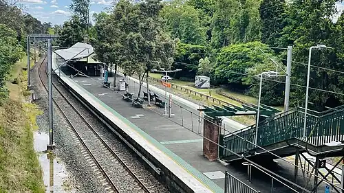 ![]() Northbound view of platform looking at station building further up, seating and stairs, November 2022 | |||||||||||