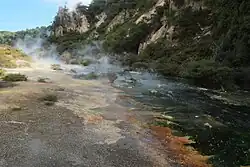 The valley's botanically rich ecosystem now includes close to 50 different tree and shrub species, around 50 ferns and allied plants and many herbaceous plants and grasses.[14] Notable species include kanuka adapting a prostrate habit on account of the warm soil temperatures, arching clubmoss capable of growing in soil temperatures of over 50 °C (122 °F),[15] and large populations of threatened fern species. Some of the plants are frost-intolerant and are restricted to hydrothermal areas in New Zealand. Different species of bacteria, such as Chloroflexus, co-exist with blue-green algae in the beds of hot water streams in the valley, in particular the overflow stream from Frying Pan Lake. The algae and bacteria form carpets of vivid hues ranging from orange to bright green and blue depending on water temperature and sulphur concentration. The margins of these streams are often populated by mosses and ferns.