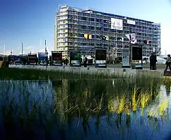 The Waitangi stream formerly flowed from around Wellington Hospital in Newtown along Adelaide Road to the Basin Reserve and then along what is now Kent and Cambridge Terraces.[1] Its outlet was the Waitangi lagoon or swamp, formed by a shingle beach which periodically gave way, causing clumps of flax and toetoe to float out into the harbour.[1][2][3] The lagoon used to harbour eel, fish, and shellfish, and was used by Māori for food gathering, fresh water, and waka launching. Early European settlers planned to dig a canal along the stream to use what is now the Basin Reserve as a harbour, but the 1855 earthquake uplifted the land and made this impractical.[4] The stream was piped underground instead.[5] The wetlands in the redeveloped Waitangi Park are fed by the outflow from the Waitangi stream, now lifted from stormwater drains and caused to flow through gravel and grass as part of the park's development.[6]