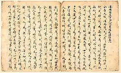 Wakan konkōbun (和漢混淆文) is a Japanese writing style which uses a mix of Japanese and Chinese writing styles that intermingles Japanese and Chinese character readings, grammar, and lexical styles. It came from the practice of using marks, added to Chinese characters, to indicate the order in which to read them for Japanese speakers.[1] Wakan Konkō Bun was often written in Hiragana and derived from Japanese reading conventions for classical Chinese. Wakan Konkō Bun shows that the development of written Japanese is inseparable from the use of literary Chinese.[2] It can be considered a transition style between pure kanbun and modern Japanese.