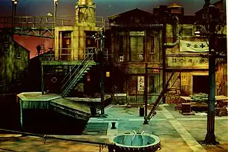The Porto Europa theme park was created by MCA Planning and Development (P&D), which was Universal Studios' creative arm prior to its renaming as Universal Creative in 1997. The park was built using American specialty vendors and Japanese construction companies, and opened in July 1994. With a footprint of 4.5 acres (1.8 hectares), Porto Europa consists of three themed areas: a French, an Italian and a Spanish town.[9] There are three major attractions, a flume ride/dark ride combination, a motion simulator/film ride, and an indoor stunt show which is now closed, with the theater space empty. The smaller attractions at opening included a jazz club, disco, cinema, laser tag, and virtual reality installation.[10] There are also retail outlets, restaurants, and street shows.[11][12][13]