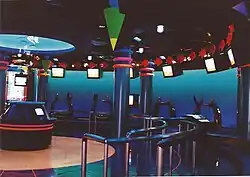 The Seafari simulator ride is in the French-themed village, and occupies the majority of the space in the main building. It features an extensive preshow, including a moon pool with a 29-foot submarine hanging over it, as if it has been launched and recovered from the deep below. Guests move from the moon pool area to the Aqualab where they meet Sammy, a CGI dolphin who appears to be swimming in a 13-foot tank at guests' eye level. From this space, guests move into a 15-passenger themed submarine, which is in the actual motion base theater. The Seafari motion bases are by Hughes Training.[15] The ride film is a 3.5 minute Computer-generated imagery (CGI) short, in color, produced by Rhythm & Hues.[16] At the time, it was considered one of the best CGI animated films ever made.[17][18] The film was later used at PortAventura Park in Spain, renamed Sea Odyssey. It opened there in 2000. Universal Studios owned PortAventura World at the time.[19]