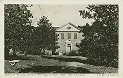 In 1902, the two-year Wake Forest College Medical School was founded on the college campus in Wake Forest, North Carolina. Thirteen students made up the charter medical class. Tuition was $37.50 per term; additional fees were charged for laboratories and student health care.[5]