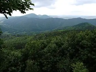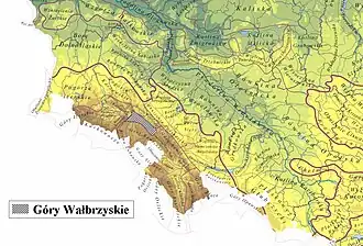 The Wałbrzyskie Mountains or Waldenburg Mountains (Polish: Góry Wałbrzyskie; German: Waldenburger Bergland), sometimes called the Wałbrzyskie Highlands or Waldenburg Highlands, is one of the three mountain ranges that form the western part of the Central Sudetes. The other ranges are the Owl Mountains and the Falcon Mountains.