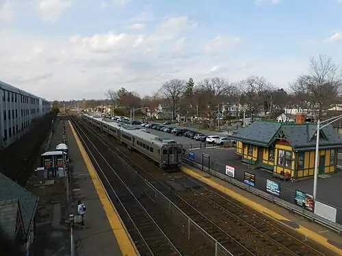 ![]() Waldwick station from pedestrian bridge at south end. Original depot at right with a transit-oriented development development on the left. | |||||||||||||||