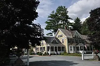 The Wales N. Johnson House is located southwest of Woodstock village, on the northwest side of Senior Lane, a former alignment of United States Route 4, whose present alignment passes just to the southeast. The original house is now at the center of a rambling complex of additions, extending mainly to its north and west. The house is 2+1⁄2 stories in height, with a gabled roof, mostly clapboarded exterior, and granite foundation. The gable ends and gabled dormers feature Victorian cut shingles and vergeboard decoration on the rake edges. A 1+1⁄2-story addition extends to the southwest, exhibiting similar styling. Porches extend across most of the main block and this addition, with chamfered square posts, jigsawn brackets, and decorative balustrades. Brackets similar to those on the porch are also found at the main roof cornice. The interior of the house features a fairly typical Georgian central hall plan, altered to open the spaces somewhat, and to provide access to the more modern wings of the building. It is richly decorated in a wide variety of woods and finishes, exhibiting to versatility of the original building owner's wood products.[2]