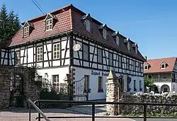 During World War II, Wüstewaltersdorf was one part of Project Riese, which was used by Organisation Todt.[3] In November 1943,[4] there was a forced labour camp in Wüstewaltersdorf for about 1,500 mostly Jewish prisoners in a decommissioned weaving mill (Websky, Hartmann, and Wiesen AG).[5] There were also Polish, Italian, Russian and Ukrainian prisoners in the camp.[6] In 1944, the camp was cleared for a typhus epidemic and converted to a hospital with 600 beds for Organisation Todt. Since 1944 it was a subcamp of the Gross-Rosen concentration camp.