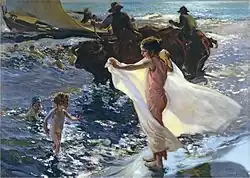 Back in Europe, Sorolla held initially in Paris and exhibited in art exhibition of the Société des Artistes Français, the 1903 painting Evening Sun, an image of fishermen from Valencia.[14] About Madrid he traveled to Valencia, where he saw his daughter Elena and the rest of the family. He attended the local art exhibition Exposicion Regional and received a second award for the work exhibited there. Inspired by the success of his trip to America and the good reviews he received at the exhibitions in Paris and Valencia, he began a prolific summer. He planned in 1911 to travel again on exhibition tour in the United States and needed new paintings. He stayed until the end of September in Valencia and created in these summer months "some of his best and most spectacular beach scenes," as his biographer and granddaughter Blanca Pons-Sorolla notes.[15] The resulting paintings of this summer beach walk provide a climax in Sorolla's career according to José Luis Alcaide.[16]