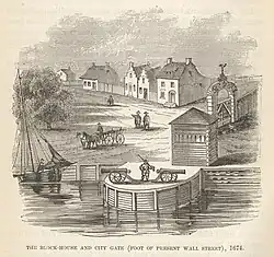 The first Anglo-Dutch War ended in 1654 without hostilities in New Amsterdam, but over time the "werken" (meaning the works or city fortifications) were reinforced and expanded to protect against potential incursions from Native Americans, pirates, and the English.[11] The English also expanded and improved the wall after their 1664 takeover (a cause of the Second Anglo-Dutch War), as did the Dutch from 1673 to 1674 when they briefly retook the city during the Third Anglo-Dutch War, and by the late 1600s the wall encircled most of the city and had two large stone bastions on the northern side.[4] The Dutch named these bastions "Hollandia" and "Zeelandia" after the ships that carried their invasion force. The wall started at Hanover Square on Pearl Street, which was the shoreline at that time, crossed the Indian path that the Dutch called Heeren Wegh, now called Broadway, and ended at the other shoreline (today's Trinity Place), where it took a turn south and ran along the shore until it ended at the old fort. There was a gate at Broadway (the "Land Gate") and another at Pearl Street, the "Water Gate".[12] The wall and its fortifications were eventually removed in 1699—it had outlived its usefulness because the city had grown well beyond the wall. A new City Hall was built at Wall and Nassau in 1700 using the stones from the bastions as materials for the foundation.[13]