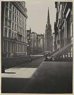 September 1929 was the peak of the stock market.[32] October 3, 1929, was when the market started to slip, and it continued throughout the week of October 14.[32] In October 1929, renowned Yale economist Irving Fisher reassured worried investors that their "money was safe" on Wall Street.[33] A few days later, on October 24,[32] stock values plummeted. The stock market crash of 1929 ushered in the Great Depression, in which a quarter of working people were unemployed, with soup kitchens, mass foreclosures of farms, and falling prices.[33] During this era, development of the Financial District stagnated, and Wall Street "paid a heavy price" and "became something of a backwater in American life".[33]