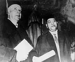 The son of a prosperous lawyer, Stevens attended Harvard as a non-degree three-year special student from 1897 to 1900, where he served as the 1901 president of The Harvard Advocate. According to his biographer Milton Bates, Stevens was personally introduced to the philosopher George Santayana while living in Boston and was strongly influenced by Santayana's book Interpretations of Poetry and Religion.[4] Holly Stevens, his daughter, recalled her father's long dedication to Santayana when she posthumously reprinted her father's collected letters in 1977 for Knopf.[5] In one of his early journals, Stevens gave an account of spending an evening with Santayana in early 1900 and sympathizing with Santayana about a poor review published at that time of Interpretations.[6] After his Harvard years, Stevens moved to New York City and briefly worked as a journalist. He then attended New York Law School, graduating with a law degree in 1903, following the example of his two other brothers with law degrees.