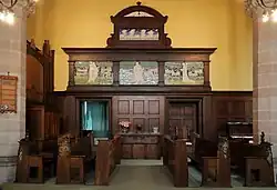 The interior is "a rare, remarkable, example of English Arts and Crafts furnishing in a Nonconformist chapel".[2] Its fittings were designed by craftsmen and designers from the Bromsgrove Guild. These include Bernard Sleigh who painted the panels on the ends of the choirstalls, communion table and pulpit, and Benjamin Creswick who carved the figures on the choirstalls. The reredos designed and by Harold Rathbone at his Della Robbia Pottery, in Birkenhead.[2] Ironwork, including the electric light fittings, was designed by Walter Gilbert, who also made copper panels for the lectern.[1]