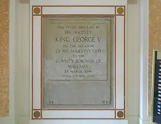 The foundation stone for the new building was laid by King George V, who was accompanied by Queen Mary, on 25 March 1914.[3] It was designed by Briggs, Wolstenholme & Thornely in the Neoclassical style and built by Moss and Sons of Loughborough.[3] In 1916, the completed building was placed under the command of the 1st Western General Hospital in Fazakerley and used as a military hospital for soldiers who had been wounded in action during the First World War.[3] After the war it was converted for its intended use as a municipal building and was officially opened as Wallasey Town Hall on 3 November 1920.[3]