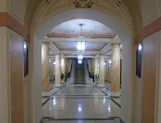 The design involved a symmetrical main frontage with seventeen bays facing onto the River Mersey with the blank end bays slighted projected forward; the central section of five bays, which projected forward more prominently, featured a doorway on the ground floor and three tall round-headed sash windows on the first floor.[1] At roof level, there was a three-stage lantern, with large round headed arches spanning the first and second stages; seated figures, designed by William Birnie Rhind and representing peace, courage, prudence and industry, were placed at the corners of the third stage, and a copper urn was installed at its apex.[1] The building, including the lantern, was 180 feet (55 m) high.[3] Internally, the principal rooms were the civic hall, which had a proscenium arch, and the council chamber, which was panelled.[1] An organ designed and manufactured by Henry Willis & Sons, which had originally been installed in City Hall in Dublin, was acquired for the civic hall in 1926.[3]