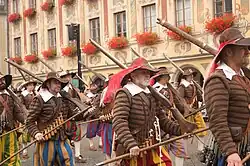 The Wallensteinfestspiele (Wallenstein Festival) in Memmingen, Bavaria, Germany is the largest historical festival in Europe and exists since 1980. Over 4,500 participants with 300 horses reenact the stay of Albrecht Wenzel Eusebius von Waldstein, known as Wallenstein, the supreme commander of the imperial forces of the Holy Roman Empire during the Thirty Years' War, in the city in 1630.[1] The festival is organized every four years in the summer by the Fischertagsverein Memmingen. In 2018, the festival was awarded the Bavarian Heritage Prize.[2]