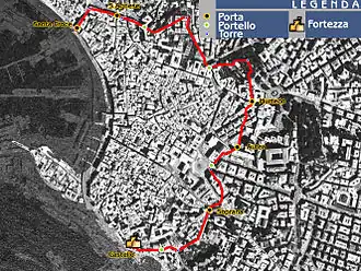 The three main gates had a monumental look, with high semicircular towers. Two of them survive to this day: “Porta Soprana” and “Porta dei Vacca”; the third one, Porta Aurea ("Golden Gate"), already partially demolished in the 18th century, was completely demolished in the second half of the 20th century. In the 13th century, the Old Pier peninsula, at the southern limit of the port, was also included inside the walls, thus completing the fortifications on the sea side of the city.