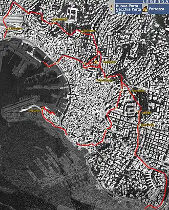 With the 17th-century expansion, the walls along the coast were reinforced with new bastions and extended beyond St. Thomas Gate to Capo Faro, where they met those descending along the western ridge. Due to port expansion, most of the walls along the sea were demolished; only a short stretch survives, recently enhanced with a walk from the ferry terminal to the lighthouse. Close by the lighthouse there was the monumental Lantern Gate, projected by Antonio Ponsonelli, built in 1633, and demolished in 1830 following the construction of a new gate a short distance away, “Porta Nuova” (New Gate), which was better suited to increased traffic.