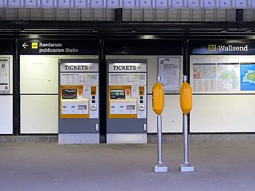 Step-free access is available at all stations across the Tyne and Wear Metro network: ramps provide step-free access to both platforms at Wallsend. The station is equipped with ticket machines, sheltered waiting area, seating, next-train information displays, timetable posters, and an emergency help point on both platforms. Ticket machines accept payment with credit and debit card (including contactless payment), notes and coins.[4][5] The station is also fitted with smartcard validators, like all stations across the network.[6][7]