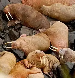 The Walrus Islands (Russian: Моржовые острова) are a group of craggy coastal islands in the Bering Sea, close to the northern shores of Bristol Bay, Alaska at the entrance to Togiak Bay. They are located 18 km to the east of Hagemeister Island, and are protected as the Walrus Islands State Game Sanctuary by the state. A part of the island group is also of archaeological importance, with numerous deeply stratified sites covering 6,000 years of human use. For this reason, Crooked Island, Summit Island and Round Island were designated the Walrus Islands Archeological District, a National Historic Landmark District comprising 14 historical sites, in December 2016.[2]