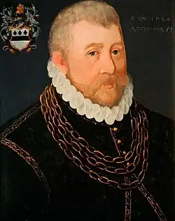 - Edward (died 1598), his heir, whose estates in the counties of Staffordshire, Derbyshire and Leicestershire produced an annual £10,000 income, married twice.[2] Firstly Mary, third daughter of Sir John Spencer of Althorp, who died childless,[3] and secondly Anne only daughter of Sir Thomas Lucy, of Charlecote, Warwickshire. They had five daughters and three sons including his heir Walter who would become 1st Lord Aston.[4][2]