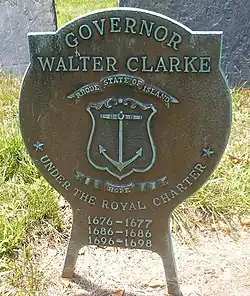 The Treaty of Ryswick restored peace to Europe, and orders were sent to the colonies to suspend all privateers against the French.[11] The orders reached New England in December 1697 and Mr. Jaleel Brenton (son of Governor William Brenton) returned from England to the Rhode Island colony and delivered them to the General Assembly at a special session held in Newport.[11] Brenton was also empowered to administer the oath required by the acts of trade, but Clarke, being a Quaker, refused to take the oath.[11] Clarke was further annoyed by the creation of a Court of Admiralty in Rhode Island.[11] Brenton brought a commission to Peleg Sanford as the Judge of Admiralty, but Clarke endeavored to persuade the Assembly to oppose it, and kept the commission from Sanford.[11] Brenton then advised the impeachment of Clarke, and also urged that Rhode Island's laws be put in print, which had never been done. These issues together prompted Clarke to resign as governor, and it is likely that his nephew, Samuel Cranston, presided as governor during the May 1698 meeting of the Assembly, when he was elected for his first of many terms.[12] Clarke would not cease his public service, however, and in 1700 was elected as deputy governor under Cranston, and was continuously elected to that office each year until his death.[1] He died on May 23, 1714, in Newport, and was buried in the Clifton Burying Ground.[1]