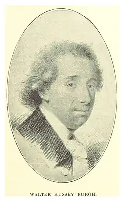 Walter Hussey Burgh SL (English: /ˈbɜːr/; BER; 1742 – 1783) was an Irish statesman, barrister and judge who sat in the Irish House of Commons, served as Prime Serjeant (1777–79, 1782) and Chief Baron of the Irish Exchequer (1782–83). He was considered to be one of the most outstanding orators of his time.[1]