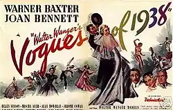 Walter Wanger's Vogues of 1938 (also known by its shortened form, Vogues of 1938) is a 1937 musical comedy film produced by Walter Wanger and distributed by United Artists. It was directed by Irving Cummings, written by Bella and Sam Spewack, and starred Warner Baxter and Joan Bennett. It was filmed in New York City in Technicolor.