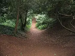 Wandlebury was a border settlement.[1] There is evidence that it was occupied by the Romans.[5] The Romans built a road from Worts Causeway to Wandlebury.[7] Two pottery sequences have been found establishing two separate construction phases.[8] It may have been inhabited into the 1st century AD.[8] It was later named Wendlesbiri (meaning, "Waendal's fort")[1] by the Anglo Saxons and used as a Hundred council rendezvous point. Sir Thomas Malory mentions a Wandesborow Castle in Le Morte d'Arthur (1470), possibly referring to the Wandlebury Ring.[9] The site has undergone considerable change since the 17th century.[10] When a house, garden and racing stable was built for King James II within the boundaries of the old fort in 1685, the inner rampart and ditch were levelled.[5] The mansion was later owned by Lord Godolphin and demolished in 1956, but the stable remains.[11] The site is now a country park.[2]