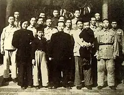 Group photo of the presidium members of the Sixth Plenary Session of the 6th Central Committee of the Chinese Communist Party (From left to right in the front row: Kang Sheng, Mao Zedong, Wang Jiaxiang, Zhu De, Xiang Ying, Wang Ming; from left to right in the back row: Chen Yun, Bo Gu, Peng Dehuai, Liu Shaoqi, Zhou Enlai, Zhang Wentian)