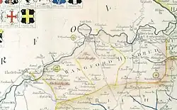 Listed as Wanneforda (inter alia) in the Domesday Book, the name is said by Walter Skeat to derive from an alternative name for the Waveney and thus to mean "ford across the Waveney".[2] Eilert Ekwall, however, taking other early forms Wainforda, Weinforde and Weineford found in the 11th and 12th centuries, derived it (like Wangford in West Suffolk) from Old English wægn-ford, a ford that can be passed by a wagon or wain. In either case the ford appears to be identified with the site of Wainford Mill, just to the east of Bungay, which in 1491 occurs as Waynforth;[3] these authorities consider that the Wangford Hundred takes its name from this Wainford. The name was also given to the Wainford Rural District which existed between 1934 and 1974.