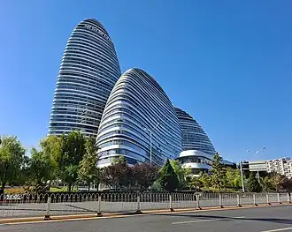Wangjing SOHO (Chinese: 望京SOHO; pinyin: Wàngjīng SOHO) is a complex of three curvilinear asymmetric skyscrapers in Wangjing in Beijing, China, between central Beijing and Beijing Capital International Airport.[1] The towers contain both office and retail space. Originally the SOHO was designed as a two-tower complex but due to height concerns it was redesigned as a three-tower project featuring towers of lower maximum height.[2] One of the more than a dozen properties developed by SOHO China, the complex officially opened on 20 September 2014.[3] The tallest of the three towers is the seventh-tallest woman-designed building in the world.