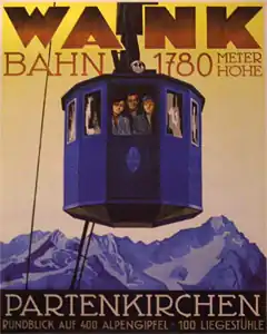 The Wank is linked to Garmisch-Partenkirchen by a cable car system called the Wankbahn, which usually operates between May and September during daylight hours.[2] Construction began in 1928 under the auspices of the Wank-Bahn AG and the cable car entered service in 1929.[3] It is 3 kilometres (1.9 mi) long and rises from 740 to 1,750 metres (2,430 to 5,740 ft) above sea level. The system has been upgraded several times since its opening. In 1960 its passenger capacity was increased from 125 to 210 persons per hour. A new Wankbahn was built in 1982, opening on 18 December, which increased the system's capacity to 1,000 persons per hour. Two 300 kW DC motors were installed to drive the cable.[4]