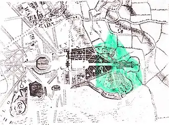 The 2nd Earl Tylney continued the plantings, but in the then fashionable natural and non-formal style. In 1813 William Pole-Tylney-Long-Wellesley invited the landscaper Humphrey Repton to improve the gardens - some of Repton's informal planting remains today.[5] Before 1828 Wellesley in a search for money cut down a great number of trees in the park, destroying many of the avenues, vistas and clumps so carefully planted earlier at such great expense by Sir Josiah Child and the Earls Tylney. He had marked a further 2,000 for felling when his son obtained an injunction in 1828 preventing him from proceeding, since it would damage the value of the land, his future inheritance. Wellesley challenged the injunction but it was confirmed against him in 1834.[6]