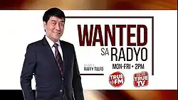 Wanted sa Radyo (lit. transl. Wanted on Radio) is a public affairs show that airs on Monday to Friday from 2:00 to 4:00 pm (PST) on 105.9 True FM with a live simulcast on television via One PH and True TV and online via livestreaming on the "Raffy Tulfo in Action" YouTube channel and Facebook page. It is hosted by Senator Raffy Tulfo, alongside Sharee Roman. Whenever Tulfo is absent from the show, mostly due to his duties as a senator, he is filled in by his daughter Maricel Tulfo-Tungol, his son-in-law and chief of staff Atty. Gareth Tungol, his co-parent-in-law Atty. Danilo Tungol, Atty. Blessie Abad, Atty. Gabriel Ilaya, Atty. Ina Magpale, Atty. Gail Dela Cruz, Atty. Joren Tan, Atty. Freddie Villamor, Atty. Jethro Aramis King, Atty. Pau Cruz, Atty. Paul Castillo, Atty. JV Bernardez (legal counsel of ACT-CIS Partylist), Aanaan Singh, Marsh Salcedo, Rhoanne Torres, or Rio Angeles.