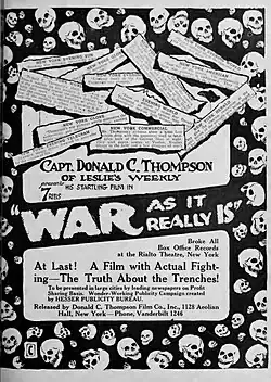 War As It Really Is is a 1916 American documentary war film shot, edited and distributed by Donald C. Thompson. The seven-reel film exposed American audiences to some of the most authentic sights and first-hand accounts of World War I before the United States entered the war.[1][2] The film was first shown in installments at the Rialto Theatre in New York City in October 1916.[3]