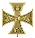 The Brunswick War Merit Cross (German: Braunschweigisches Kriegsverdienstkreuz)[1] also known as the Ernst-Augustkreuz, was a military decoration of the Duchy of Brunswick. The Cross was established 23 October 1914 by Ernest Augustus, Duke of Brunswick. The cross was awarded to all ranks for distinction in war. On 20 March 1918, a first class of the Cross was created in pinback form, with the existing Cross becoming the second class. This brought the Cross in line with awards of other German States like Prussia with the Iron Cross. The cross was awarded on a blue ribbon with yellow stripes for combatants and on a yellow ribbon with blue stripes for non-combatants.