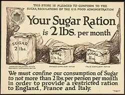An American poster from World War I explaining sugar rations. Sugar was being conserved to provide for allied countries in Europe and support the war effort.