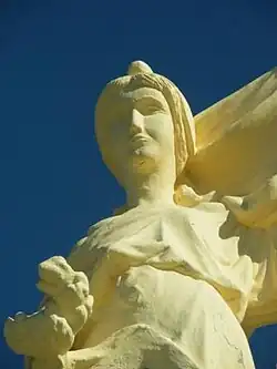 | Long Monument aux morts | Long Somme | Long's war memorial features a bronze cast by the foundry Fonderies Montagutelli Frères of Paris. This was the work of the sculptor Georges Chauvel (1886–1962). It is entitled "La France couronnant un soldat blessé " and shows a wounded soldier receiving a crown of laurels from a female figure representing France. On the pedestal itself there is a bas-relief this showing the mobilisation of Long and featuring the then mayor of Long and the men of Long killed in the war all responding to the call to mobilise.[16] | |