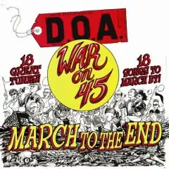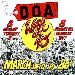 War on 45 is an eight-song 12" EP released by the hardcore band D.O.A. in 1982.[3] It was re-released in 2005 on CD with an additional eleven songs, but without the composition "Let's Fuck," for a total of eighteen tracks. The original cover has "MARCH INTO THE 80'S" written on it, while the 2005 version reads "MARCH TO THE END."