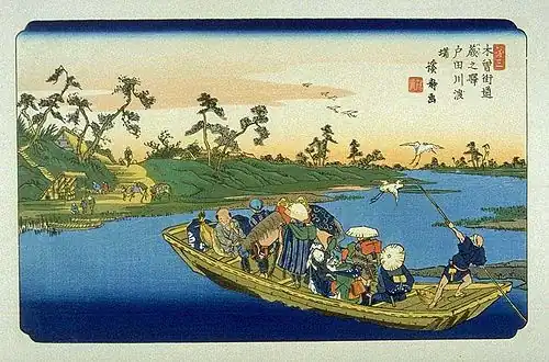 Keisai Eisen's ukiyo-e print of Warabi-shuku dates from 1835 to 1838, and depicts the ferry crossing the Arakawa River at dusk. On the small boat are a pair of itinerant blind women musicians with shamisen, a man and his horse, and a porter sitting smoking in the bow. The boatman propels the boat with a rear oar, while on the far bank more travelled await the arrival of the ferry.