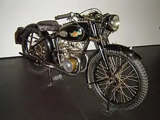 • A 1.97 hp machine with a Villiers engine of semi-incline design. The transmission includes a three speed gearbox with all chain drive, clutch and kick-starter. A saddle tank was introduced in this year, finished in red and black, with the saddle let in at the end for rider comfort. Wellbase wheels were fitted with 25 x 3.00 tyres together with internal expanding brakes. Forks were of central spring type. A six volt Lucas electric lighting system comprised battery, generator, headlamp and tail light. Speeds between 55 and 60 mph and fuel consumption of 150 mpg were supposed to be attainable.[61]