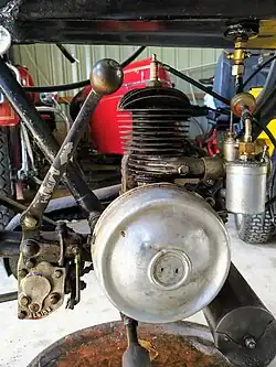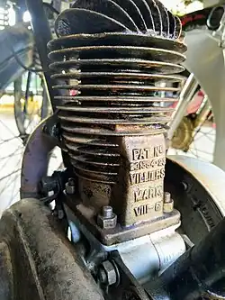 • The larger, 2.5 hp sports model was of the same construction but had a two-gallon petrol tank, separate oil tank and 25 x 3.25 well-base tyres. It had the 2.5 hp, 247 cc sports Villiers engine with twin ports and detachable aluminium cylinder head. Apparently it was an excellent hill climber and fast, and was capable of 55 mph. It was fitted with a three speed gearbox, clutch and kick starter, twin[51] long nickel exhaust pipes and had 6V electrics, including a battery. It was fitted with a separate oil tank and had larger brakes than the 1.5 hp model. The existence of the 1929 2.5 hp model is also attested to by a later advert.[52] (The suggestion[44] that the 2.5 hp model was added to the range in 1929 does not seem reliable, and may relate solely to availability from the Queensland agent.)