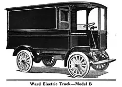 The Ward Electric car was a four-passenger coupe costing $2,100 and went 100 miles per charge.[2] In 1916, the price was $875.[3] The battery was an Edison battery.[3] In 1916, the price was dropped to $1,295.[4] The company stopped electric car production after 1916. In the year 1928, the model program consisted of types B, C, E, G, J, and M. The model B was offered for 1770 dollars. The model C for 1960 dollars, the model E for 2440 dollars, the model G for 2920 dollars, the model J for 3980 dollars, and the model M for 4890 dollars[5].It continued to make trucks until 1937.[1]