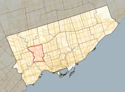 The ward is largely made up of what was the former city of York prior to Metro Toronto's 1998 amalgamation. It is bordered to the west by the Humber River and the east by a Canadian National Railway track. The north boundary is Highway 401 and the south boundary is a Canadian Pacific Railway track.[3]