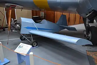 The fuselage is built around four 3/4 in (19 mm) square longerons, with diagonal bracing and ply formers. The skin is 1/16 in (1.6 mm) ply, with flat surfaces apart from curved decking. There is a single seat open cockpit. The fixed tailwheel undercarriage has each mainwheel mounted on a pair of steel tubes forming a narrow 'V' and fixed under the fuselage. Single bracing struts run forward from the wheel mountings to the lower longerons forward of the wings. Go-Kart wheels and tyres are used, without brakes. A two-cylinder, horizontally opposed 14 horsepower Douglas motorcycle engine, built in 1925 and driving a two blade fixed pitch propeller, was the original powerplant though this may have been replaced later by a Sachs-Wankel motor.[1]