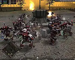 Some critics stated that the game's weak points included its complexity; some reviewers disliked how much micromanagement was required to effectively field one race against another, saying that this complexity was detrimental to the game. As one reviewer mentioned, "...when I stop having fun, I stop playing."[15] The learning curve was also stated as being very steep for an RTS, due to each race being different.[19] Another thing critics disliked was the player's inability to 'zoom out' with the in-game camera; this sometimes got in the way of large battles, and was especially noticeable when playing as or against the Tau, as their long-range weapons often resulted in them engaging their targets off-screen.[20] While general consensus on the revamped single-player campaign was positive, some critics felt that it was not particularly challenging; they found that the AI was strategically weak, and there were no random elements in most skirmish missions that would enhance replayability.[21] The usage of a random auto-resolve feature to determine which races won which territories was seen as a downside; also, one critic found that the AI attacked his homebase very rarely, and that they would attack insignificant zones regardless of the opportunity to capture more significant ones.[22] In terms of new additions, some critics felt that the races, in particular the Necrons, were overpowered.[15]